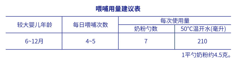 平勺奶粉 依照喂哺用量建議表,加入正確份量(平勺)的奶粉,請勿刻意壓平量勺。